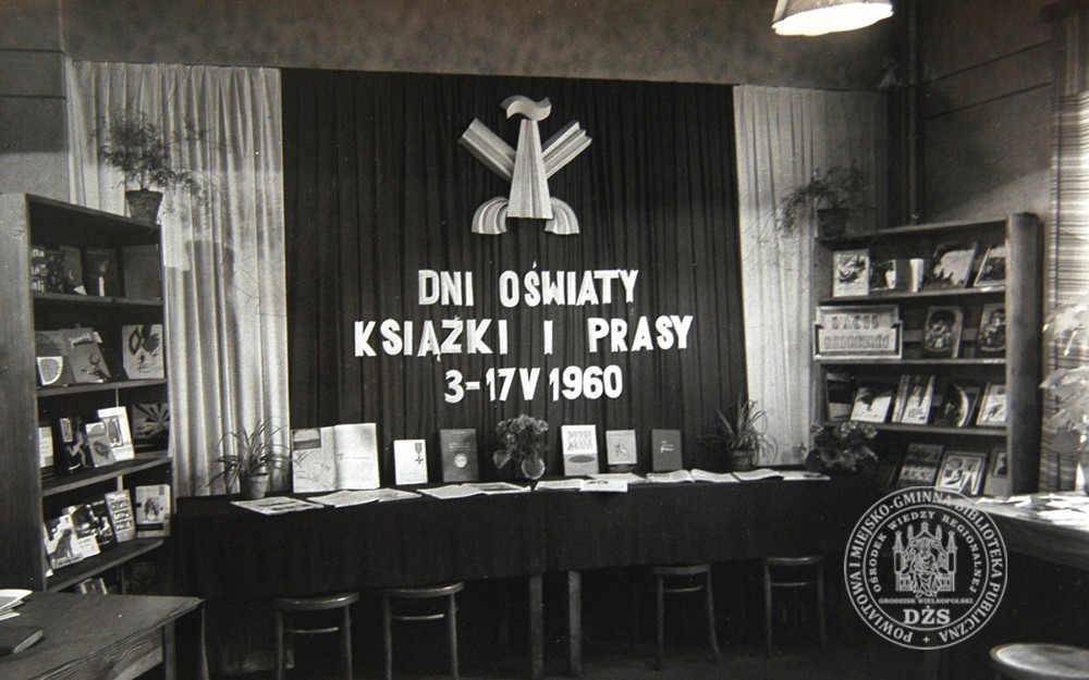 Wystawka z okazji Dni Oświaty Książki i Prasy. Biblioteka mieściła się wówczas w lokalu obecnej Księgarni (Firma Maruszewski) przy ul. Szerokiej.