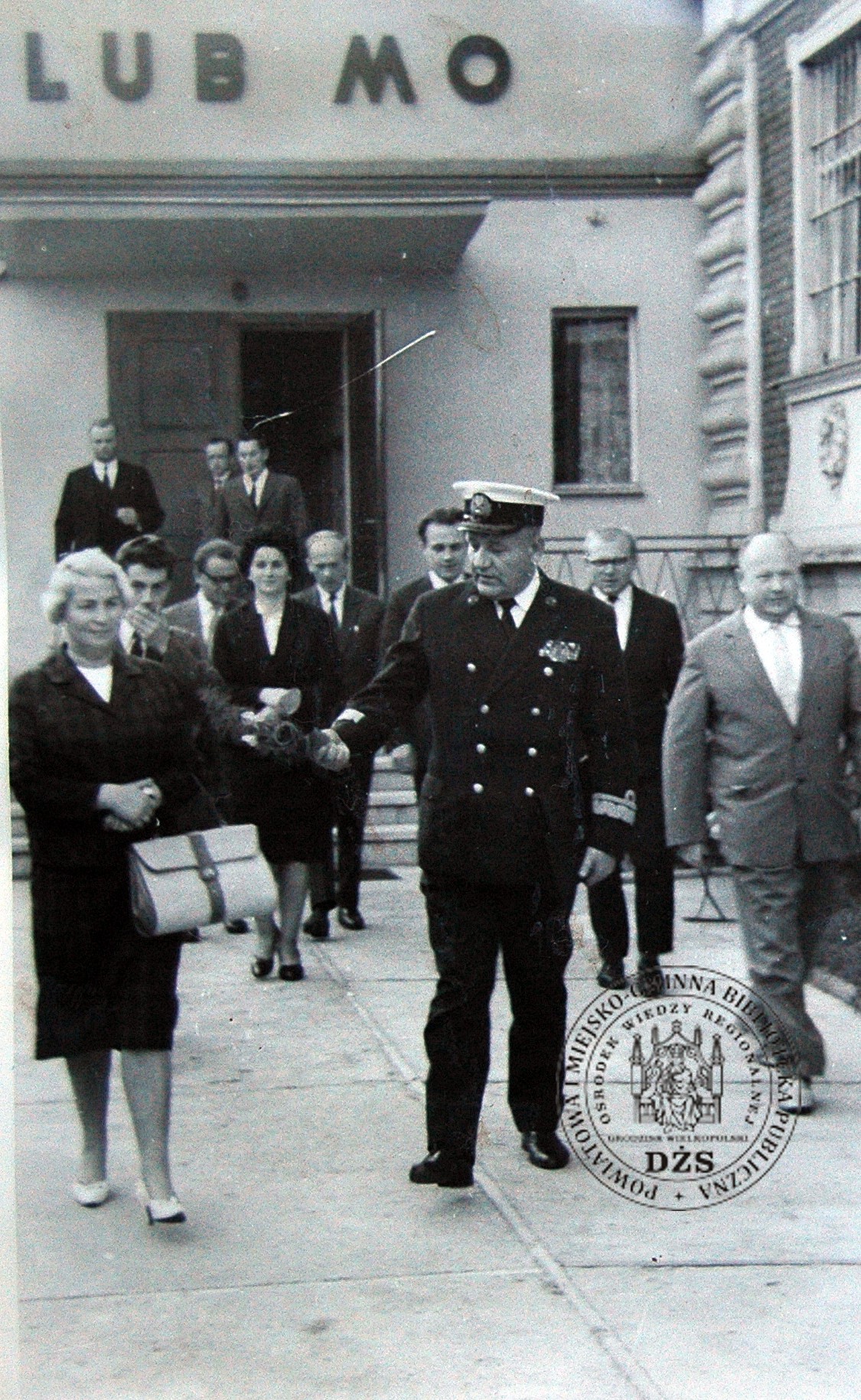 Spotkanie z Kontradmirałem Józefem Sobiesiakiem. Zdjęcie wykonano przed Klubem MO w Nowym Tomyślu, który mieścił się przy ul. Armi Czerwonej - obecnie Piłsudskiego