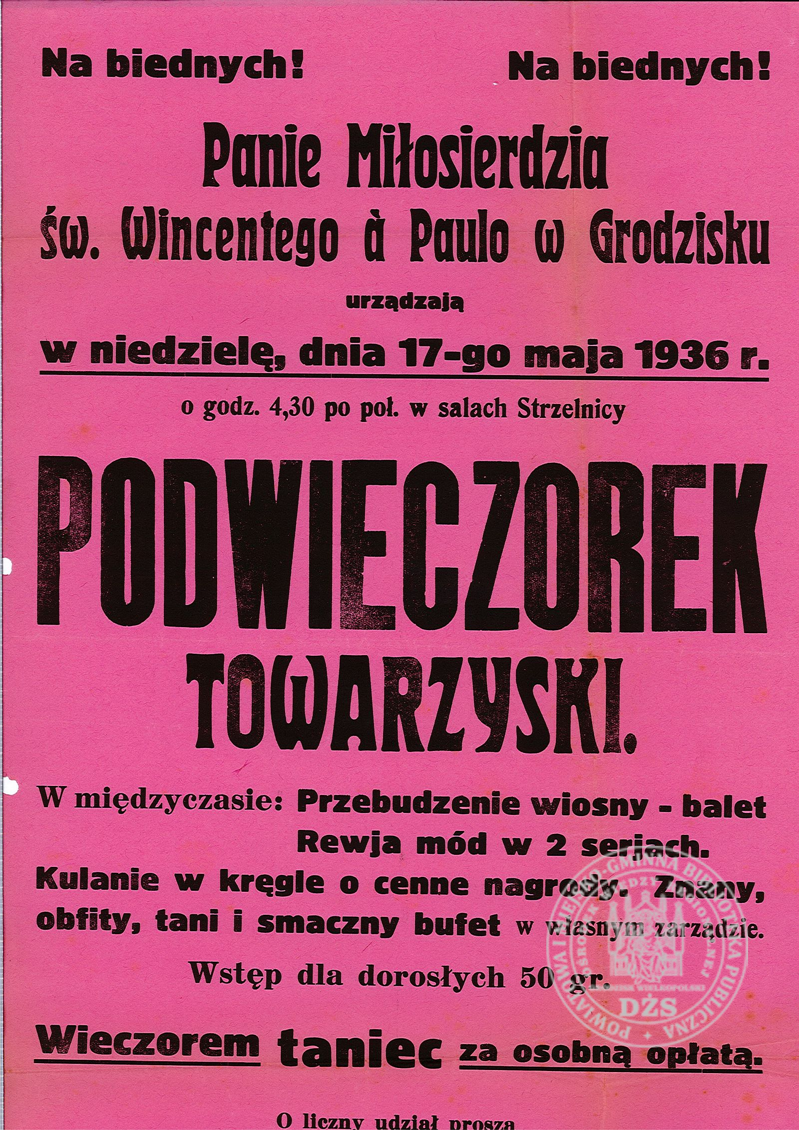 Plakat Stowarzyszenia Pań Miłosierdzia św Wincentego a Paulo. Podwieczorek towarzyski 17 maj 1936 r.