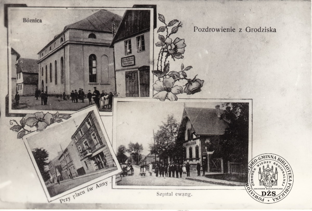Grodzisk Wielkopolski. Pocztówka. Szpital ewangelicki. Bóźnica. Plac św. Anny.
