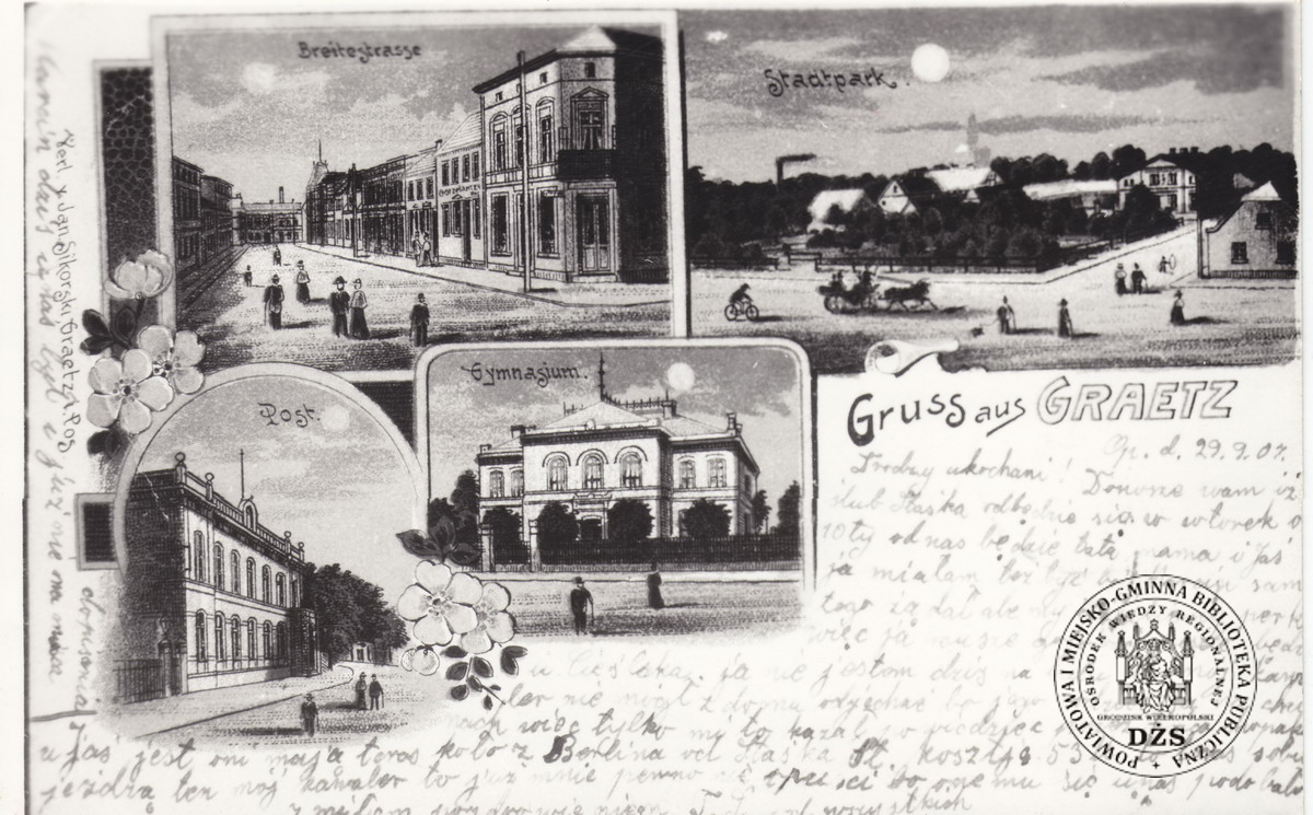 Pocztówka. Grodzisk Wielkopolski. Park Miejski. Poczta. Gimnazjum.