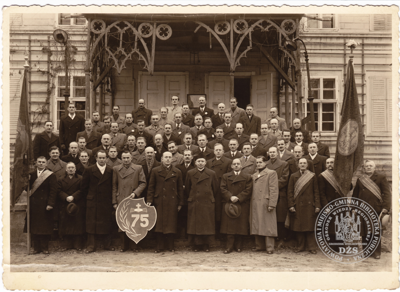 Obchody 75 - lecia Towarzystwa Rzemieślników Katolickich. Zdjęcie pamiątkowe przed pałacem w Parku miejskim.