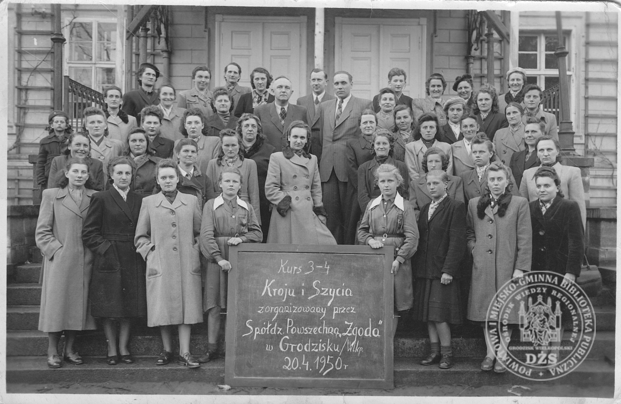 Uczestnicy Kursu Kroju i Szycia. Zdjęcie pamiątkowe na schodach pałacu w Parku Miejskim. Spółdzielnia Powszechna "Zgoda"