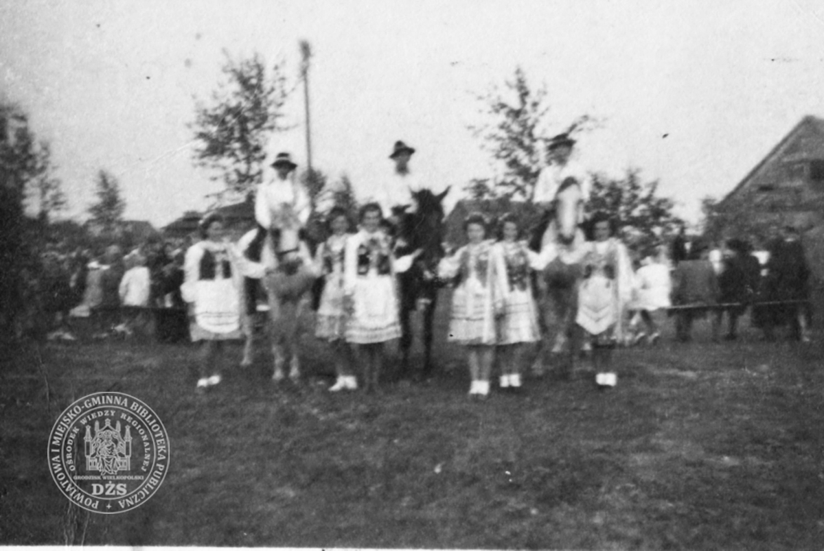 Opis: Radośnie i uroczyście obchodziła gmina Grodzisk swe tradycyjne święto plonów -Dozynki. Olbrzymi plac zabaw przygotowany na łące pegerowskiej w grąblewie przybrał odświętny wygląd. Była niedziela, gorąca, słoneczna, sierpniowa. Dzień liczył 25 - rok 1953. W części artystycznej wystąpił zespół naszej świetlicy z samorodną sztuczką dożynkową "Stare i Nowe", której treść została zaczerpnięta z własnego środowiska. Przed oczami chłopskiej gromady przesuwały się w oryginalnych strojach przedstawiciele "zła" i "dobra", "starego" i "nowego" ( dwie kumoszki - plotkarki, nierób i bumelant, kułak i wyzyskiwacze, stonka - "Mis Kolorado", brygada zniwiarzy - przodowników, aktyw partyjny gromadzki, "Dzieci narodu polskiego" oraz zespół taneczny....
