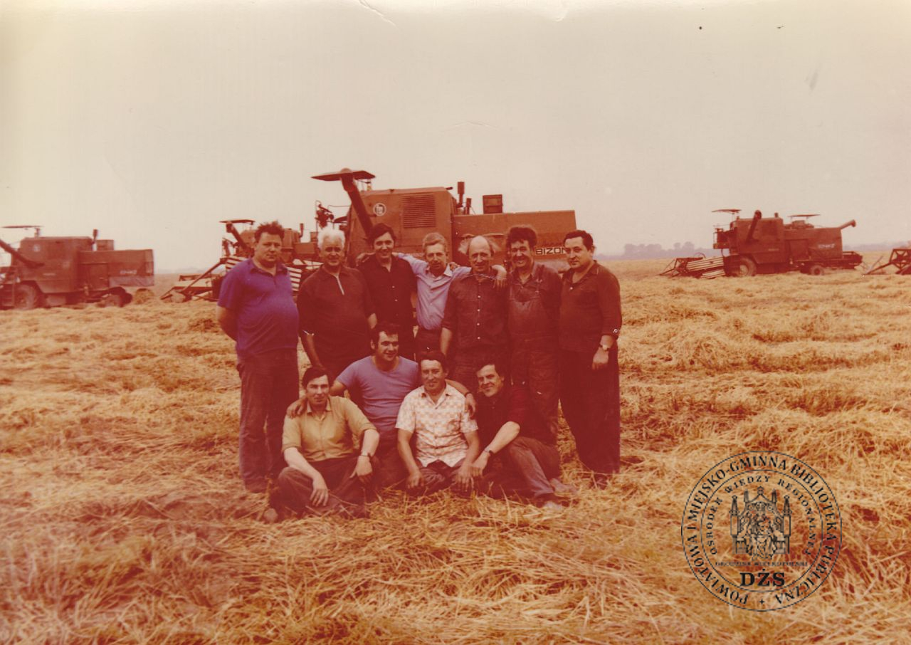 Pracownicy PGR (Państwowe Gospodarstwo Rolne) w Ptaszkowie. Zakończenie żniw.