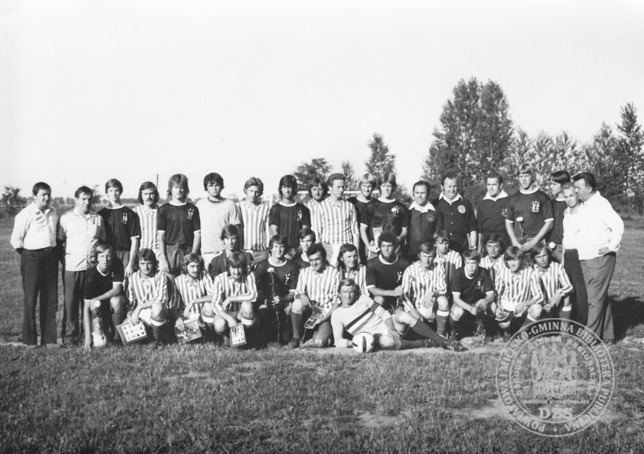 Drużyna LZS Ptaszkowo ( stroje w paski ) i drużyna uniwersytecka z USA (Stan Iowa) po rozegranym meczu.